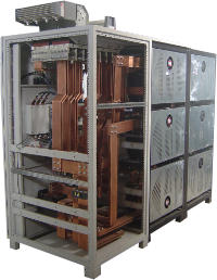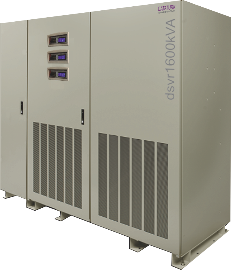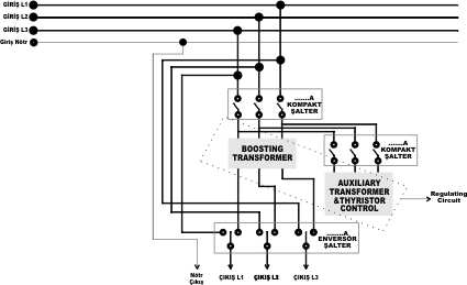 SAG-SURGE Protection ; It is an 'effective protection circuit' which protects the receivers against sudden collapse, rise and thousands of volts spikes in microseconds. “Effective protection circuit” generally operates in the form of both symmetrical and asymmetric voltage branches. Effective protection circuit; The three-stage protection circuit consisting of fast-response suppressor diodes is supported by coarse protection with the varistors in the middle protection stage and the strong gas overvoltage conductors. Protection stages separated from each other by ohmic resistors. This allows the power to be optimally distributed in the protection circuit when the overvoltages are suppressed and the pulse currents need to be deflected. Compact Switch (MCCB) Protection The regulator is able to switch on / off from the panel. In cases such as over current, over voltage, low voltage and output short circuit, the device is electronically protected and the output is cut off. '' Booster Transformer '' Application It is applied for 500kVA and in all powers above 500kVA. In addition to the harmonic elimination feature, 20% of the load current is passed over the semiconductor and the cost is reduced and the reliability of the system is increased.